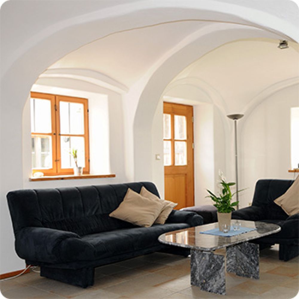 Ein uriger Seminarraum für Workshops und Spiele. Zum Erholen und geselligen Beisammensein lädt eine Couchecke ein.