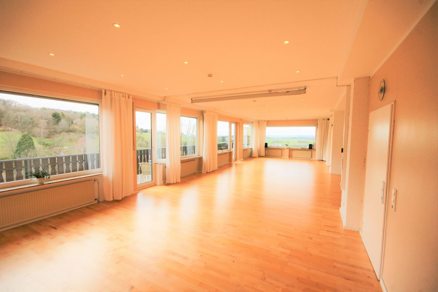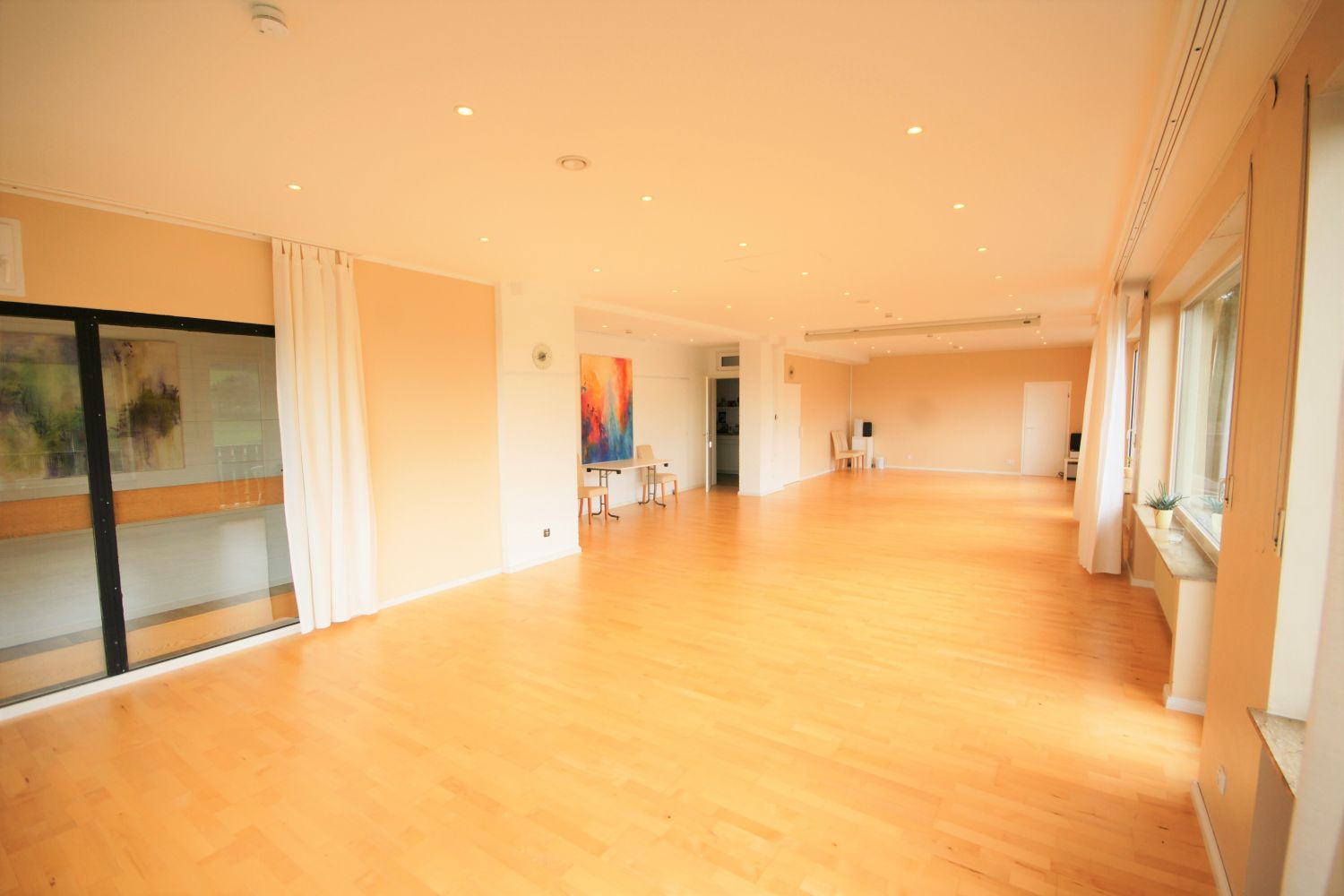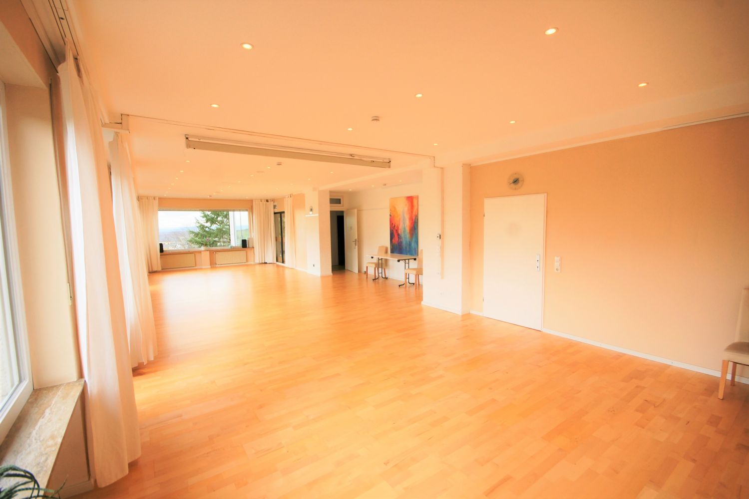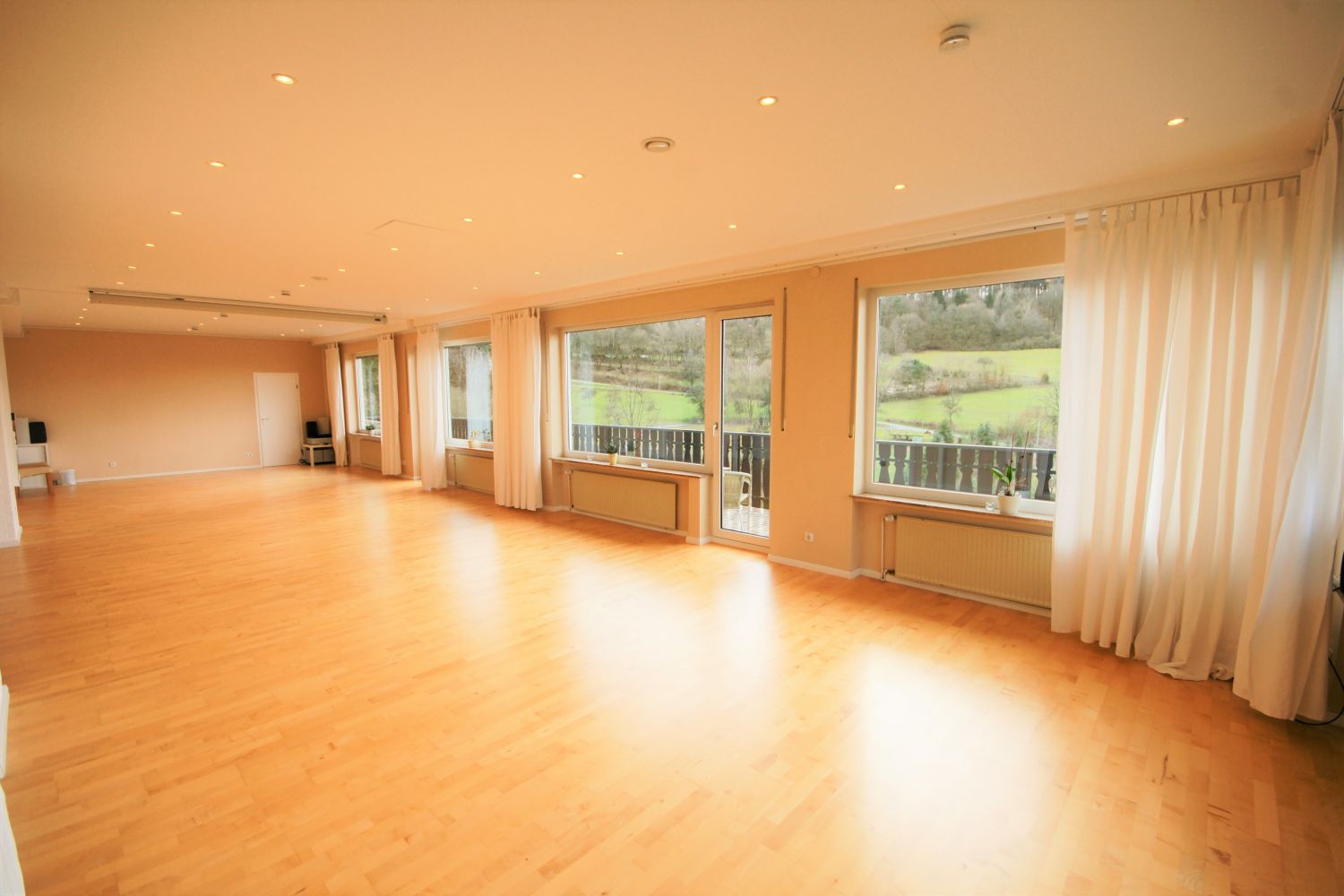 Unser größter Raum mit 92 m², lichtdurchflutet, traumhafter Talblick, für Gruppen bis zu 35 Personen, Balkon, Parkettboden, Fußbodenheizung, Beamer & Leinwand integriert, Kohlenmonoxidmelder und eine Luftabsauganlage, die in die Decke integriert ist.