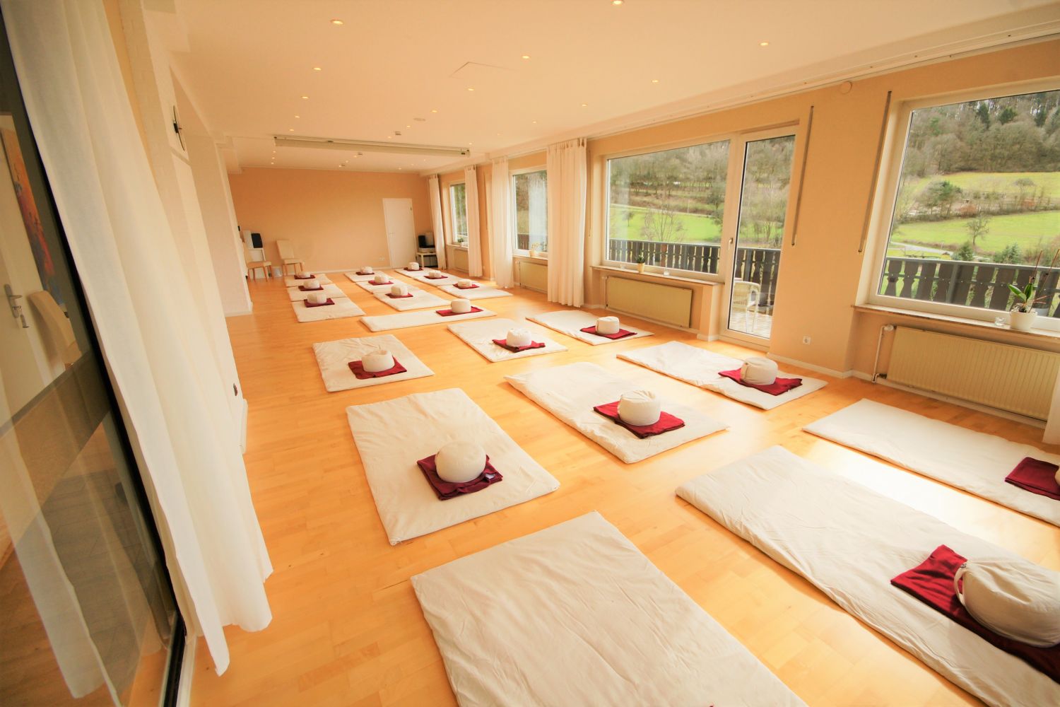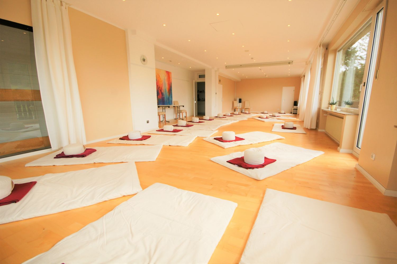 Das Haus verfügt über 2 Seminar-/Tagungsräume mit 92 m² und 25 m². Die hellen Räume haben Ahorn-Parkettböden und können individuell nach Ihren Wünschen vorbereitet werden. Hierfür stehen Ihnen bequeme Stühle, Tische, Sitzkissen, Decken, Yoga-Matten und Shiatsu-Matten zur Verfügung. Zur weiteren Ausstattung gehören: Musiksystem, DVD-Player, Beamer, Flip-Charts und Moderationswände. Bitte sprechen Sie uns für Sonderwünsche an.