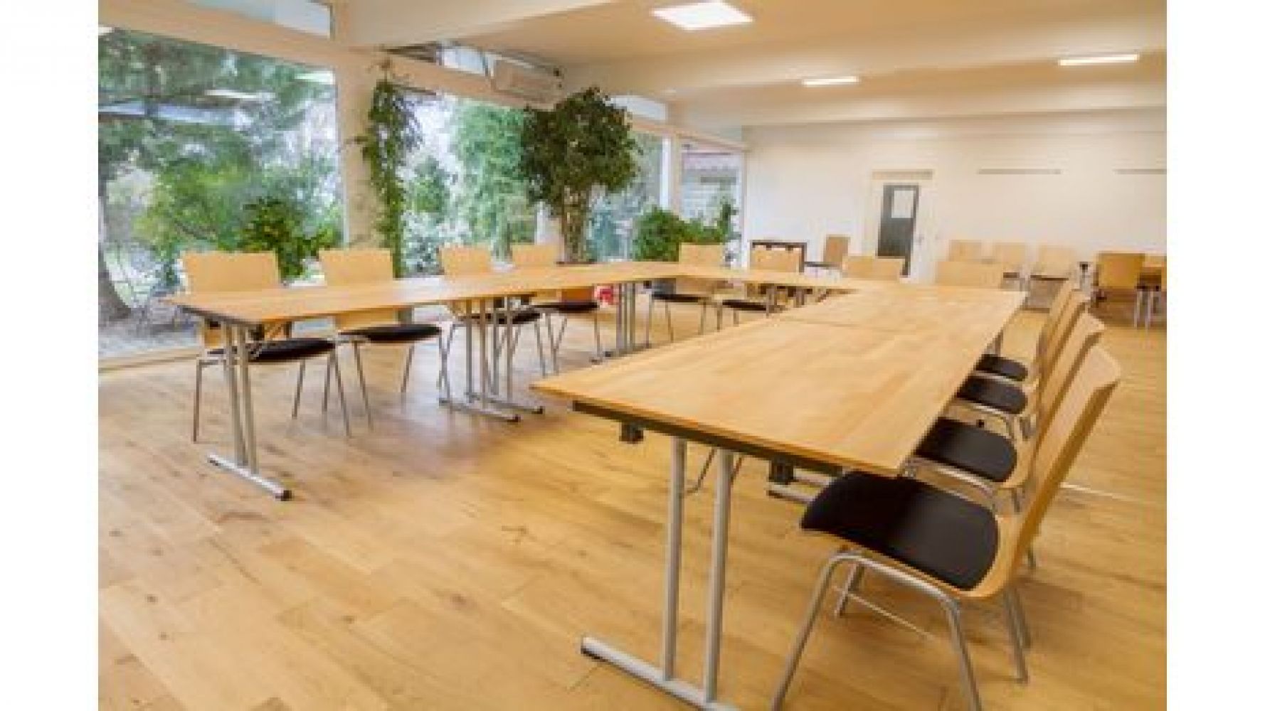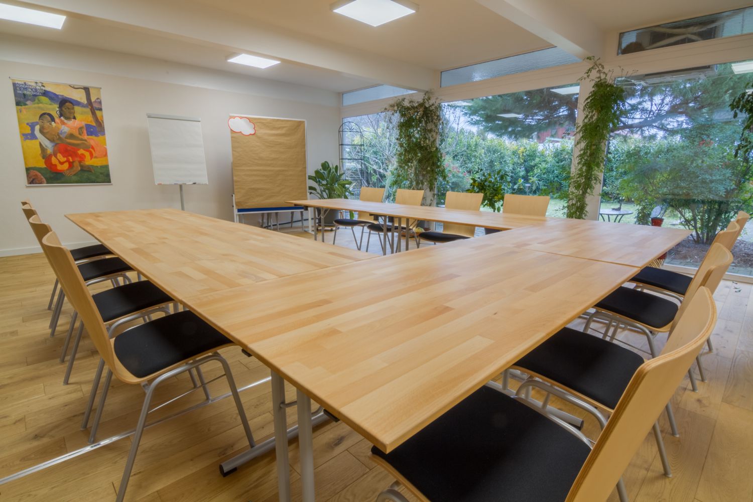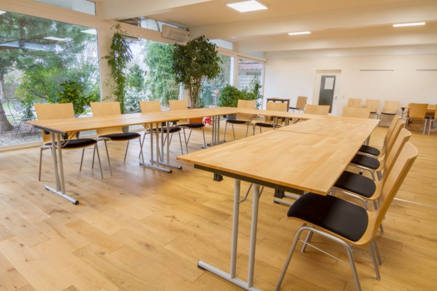 Unser Seminarraum ist mit einem Holzboden ausgestattet und im Winter sorgt ein Holzofen für behagliche Wärme. Der Raum ist mit gängigem Tagungsequipment ausgestattet. Eine breite Fensterfront gibt den Blick frei in den Garten.