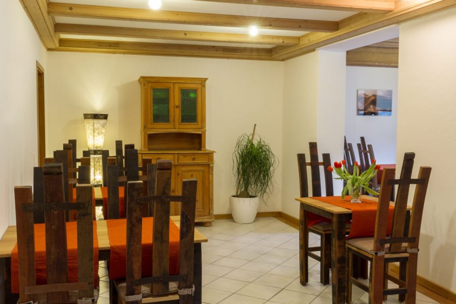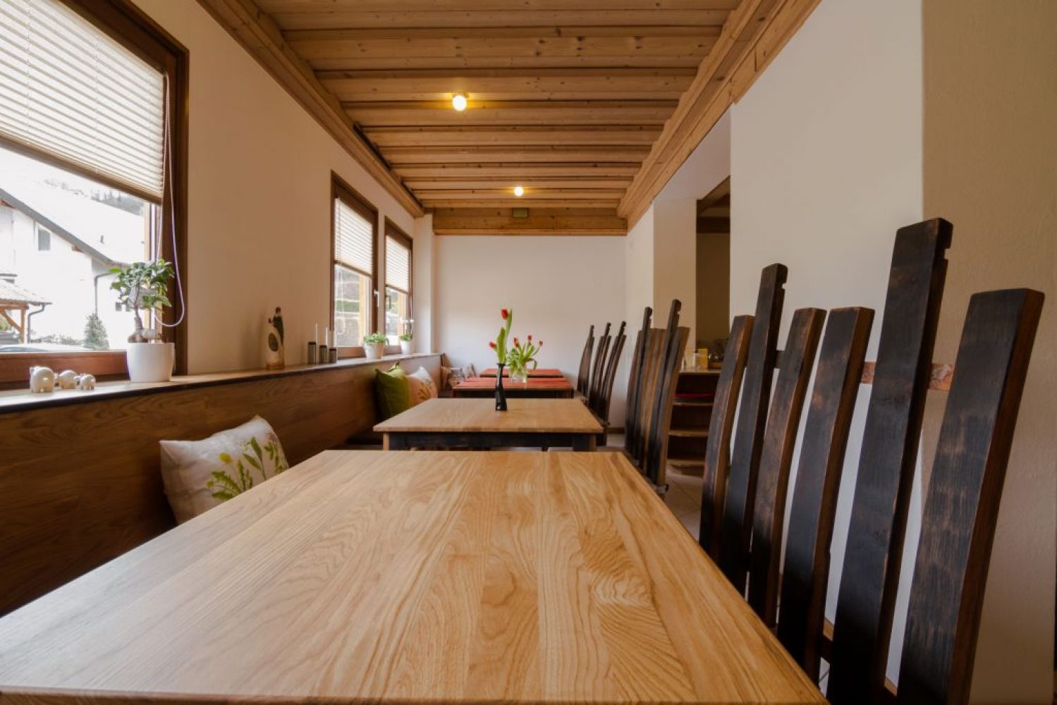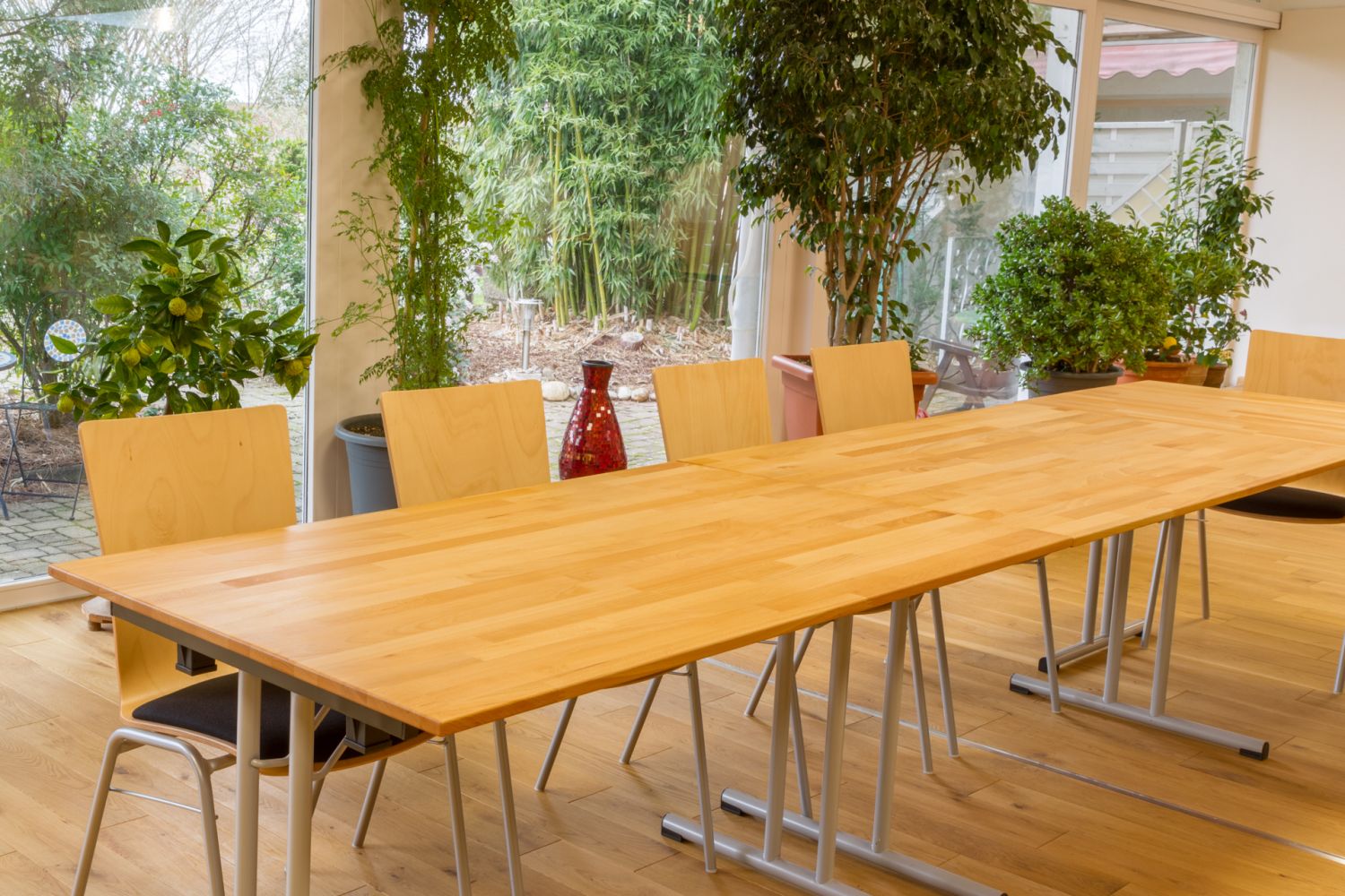 Unser Seminarraum ist mit einem Holzboden ausgestattet und im Winter sorgt ein Holzofen für behagliche Wärme. Der Raum ist mit gängigem Tagungsequipment ausgestattet. Eine breite Fensterfront gibt den Blick frei in den Garten.