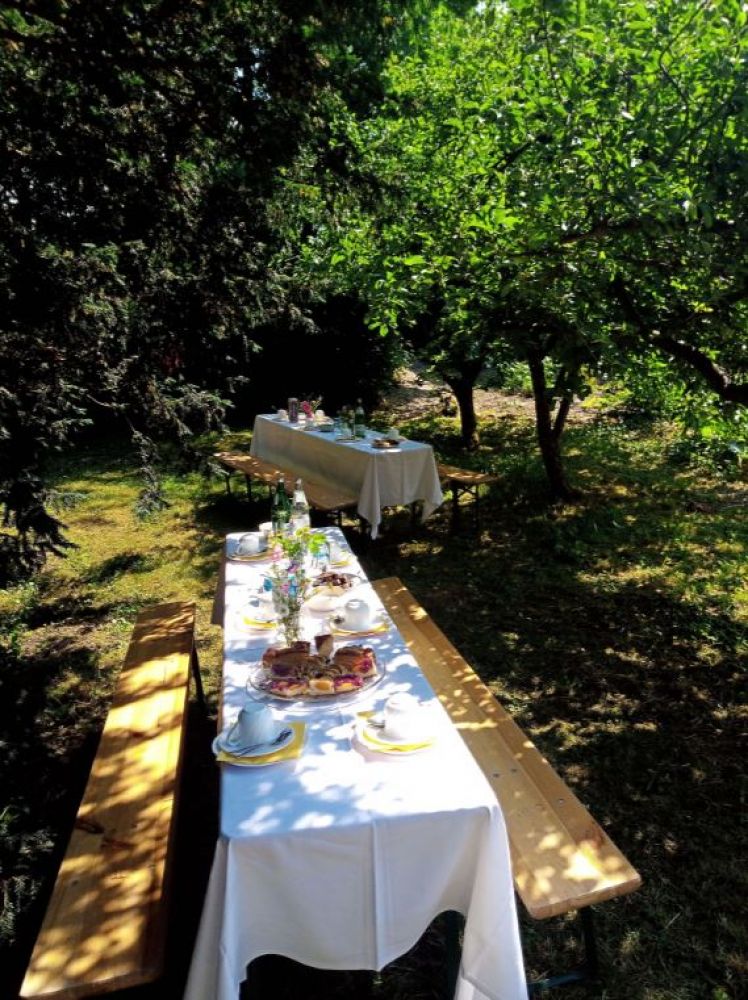 , nach Absprache mit Euch individuell abgestimmt. Unsere freischaffenden Köchinnen kochen frische vollwertige Gerichte (vegetarisch und auf Wunsch vegan). Ein Großteil der Zutaten stammt aus biologischer Landwirtschaft. Gerne vermitteln wir Euch auch an lokale Cateringservices!
