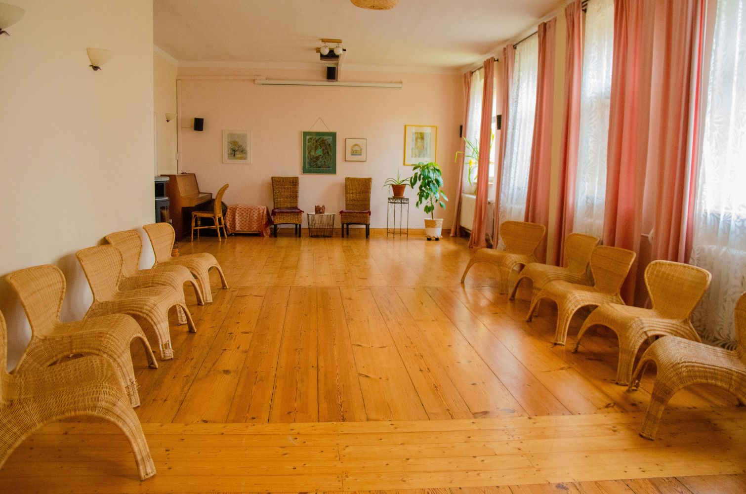 Seminarraum Der 60 qm große, helle und freundliche Seminarraum im Haus Ananda bietet Platz für Gruppen aus den Bereichen Körper- und Atemarbeit und für alle Formen von Meditations- und Achtsamkeitspraxis sowie für Entspannungsverfahren, Tanz- und Chorgruppen sind uns willkommen und natürlich Familien! Der Raum ist ausgestattet bei Bedarf mit Korbsesseln, Meditationskissen, Decken und/oder Matten. Bestuhlung: max. 30 Personen Yogamatten: 12-15 (max. 18) Personen