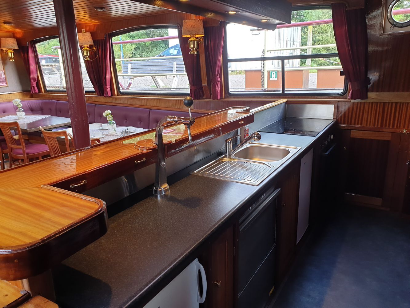 Auf unser Schiff sind auch Fahrten ohne Verpflegung buchbar. An Bord wurde eine einfache Bordküche eingebaut, wo man neben kalte Mahlzeiten mit dem neuen Induktionsherd nun auch warme Mahlzeiten zubereiten kann. In die Bar mit Spüle finden Sie ein Geschirrspüler, eine Kaffeemaschine, ein Wasserkocher und ein Backofen. Für die Sicherheit gibt es kein Gas in die Küche, aber ist alles elektrisch.