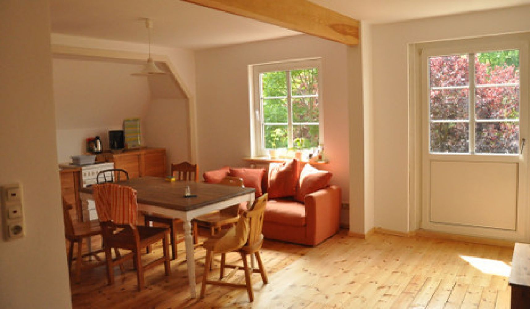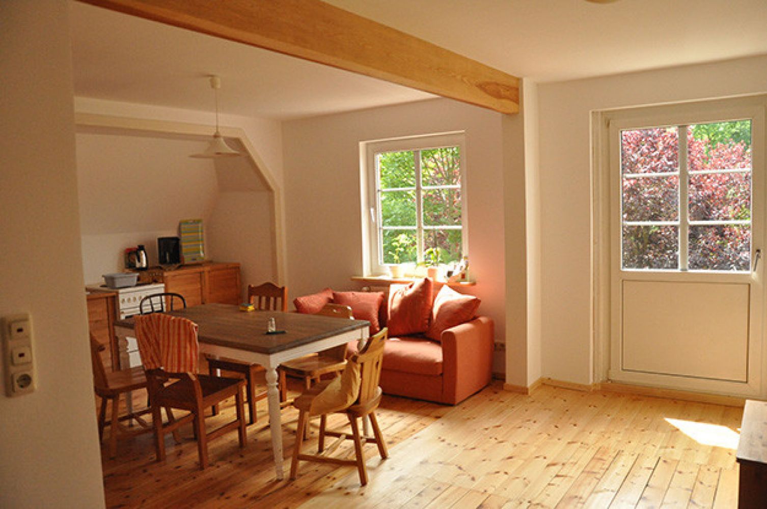 Im Essbereich steht ein Kaminofen. Der Garten mit seinen alten Obstbäumen schlängelt sich etwas ins Tal. Es gibt dort schöne geschützte Ecken sich zu entspannen und zu erholen. Hier gibt es eine Feuerstelle. Bei uns kann auch gezeltet werden. Drethem liegt direkt an der Elbe im Biosphärenreservat. Hier wohnen unter anderem Biber, Seeadler, Wildgänse und viele andere Tiere. An der Elbe gibt es Buhnen mit kleinen Badestränden. Ein sehr schöner Wanderweg führt an der Elbe bis Tiesmesland. In 20 Minuten Fußentfernung erreicht man den Kniepenberg. Der Aussichtsturm dort bietet einen weiten Blick über das Elbtal. Die nächsten Einkaufsmöglichkeiten findet man in Hitzacker, etwa 10 km entfernt. Empfehlen können wir Albia, den Kanuverleih mit Bringeservice.