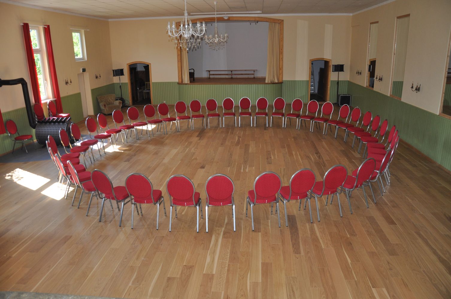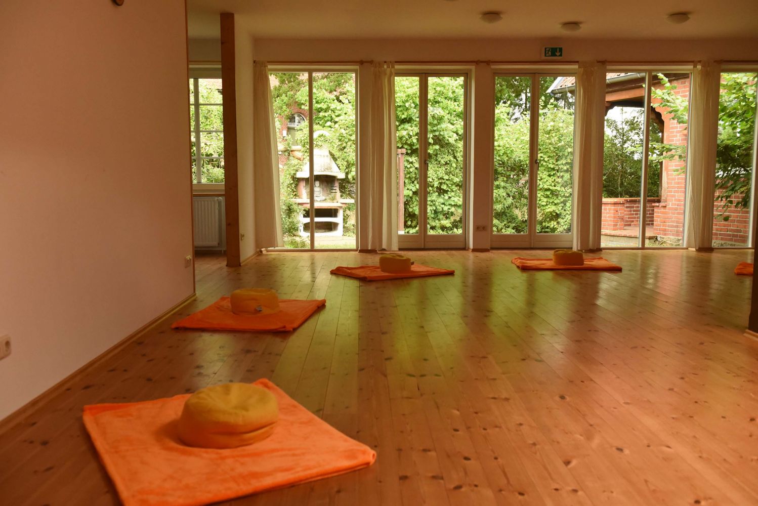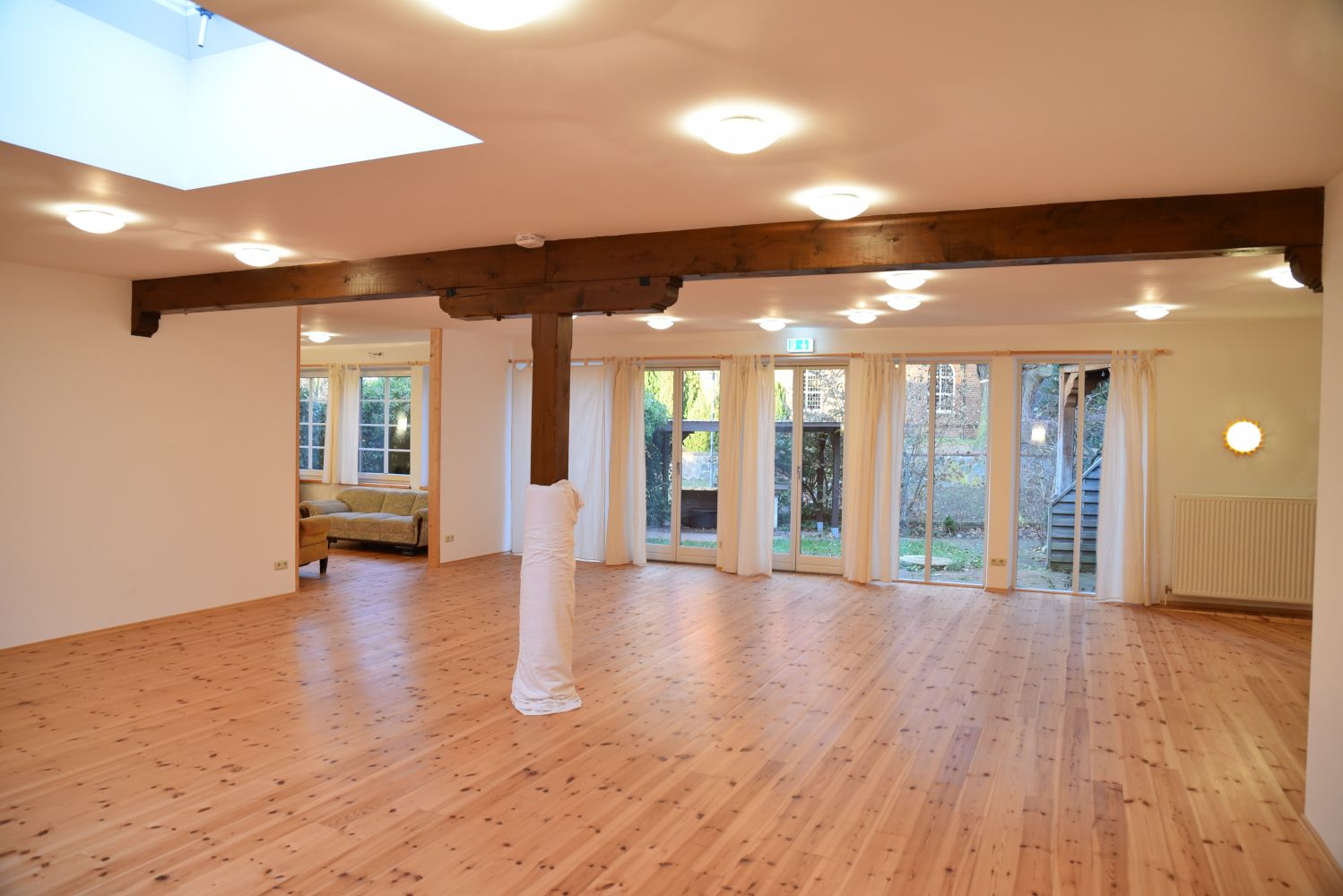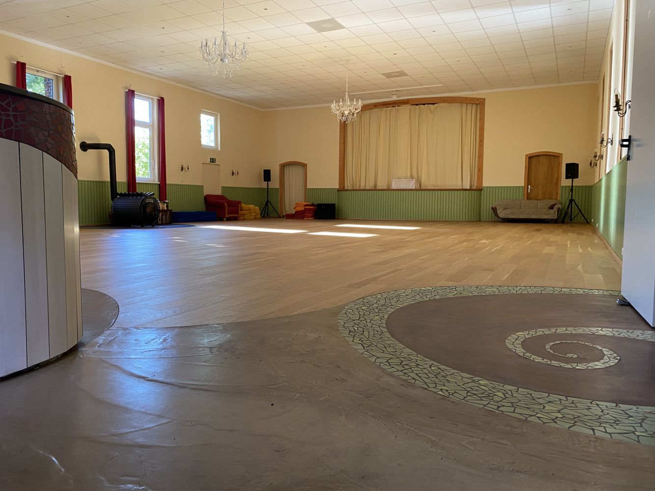 2 Seminarräume, TanzsaalDer große Seminarraum, bestehend aus zwei Teilen, ist ein heller Raum mit großen Fenstern nach Osten gerichtet, einem Holzfußboden und einem gestimmten Flügel. Er hat eine Raumteilung (85qm+50qm). Der kleinere Teil ist mit gemütlichen Sofas ausgestattet. Der Raum, der Toilettenbereich sowie der Haupteingang, ist komplett behindertengerecht ausgebaut. Außerdem haben wir einen 235 qm Saal mit Parkett-Schwingboden und Bühne zur Verfügung. Ausstattung: Meditationskissen, Yogamatten, Decken, hochwertige Musikanlage auf Wunsch mit Funkmikrofonen, 2 Flipchart, Leinwand. Auf Wunsch kann ein Beamer bereit gestellt werden. Im Erdgeschoss befindet sich noch die Seminarküche (90 cm-breiter Herd, 3 Geschirrspüler, Kaffeemaschinen, Großkaffeemaschine, 10l-Warmwasserbereiter) der Essraum-bzw. Atelierbereich und ein kleiner Seminarraum 41 qm, der auch als zusätzlicher Speiseraum genutzt werden kann.