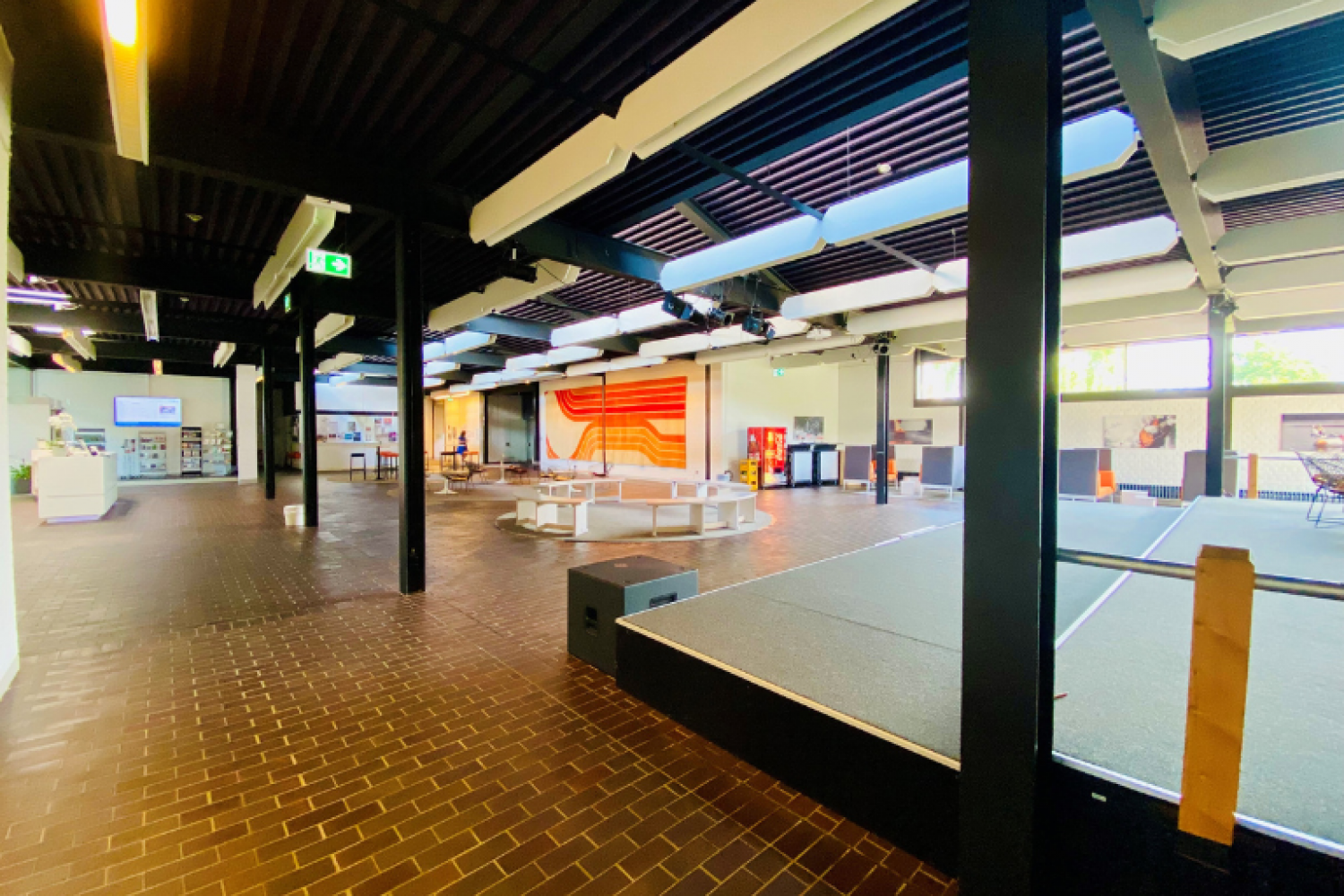Das Forum für bis zu 180 Personen ist das Herzstück der JugendAkademie. Es ist bewusst so angelegt, dass sich hier die Wege zu den verschiedenen Bereichen kreuzen. Damit wird es wie ein Marktplatz immer wieder zum Ort der Begegnung und der Kommunikation. Hier finden regelmäßig landesweite Veranstaltungen für Multiplikator*innen sowie Konzerte und Theaterabende statt.