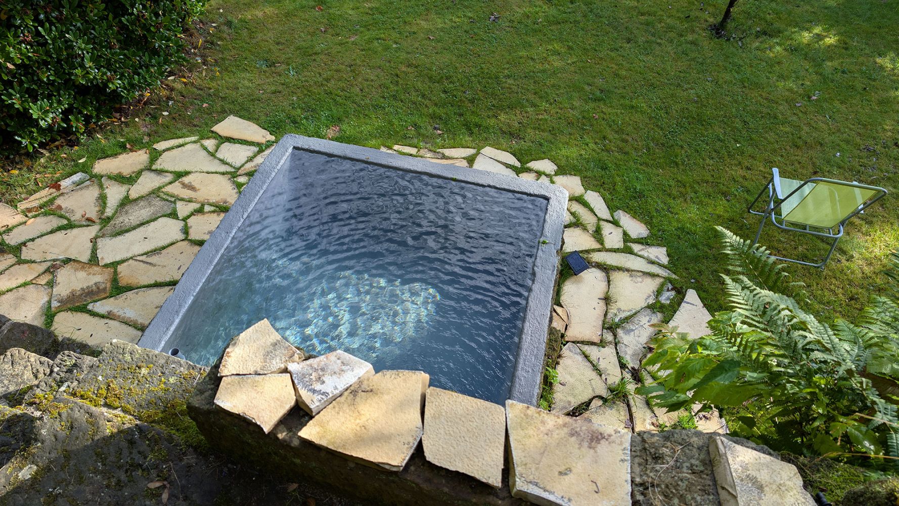 - Gartenbereiche rund ums Haus – vorne, hinten, unten. Mit Sitzplätzen, Liegewiese, Quellwasserbecken.