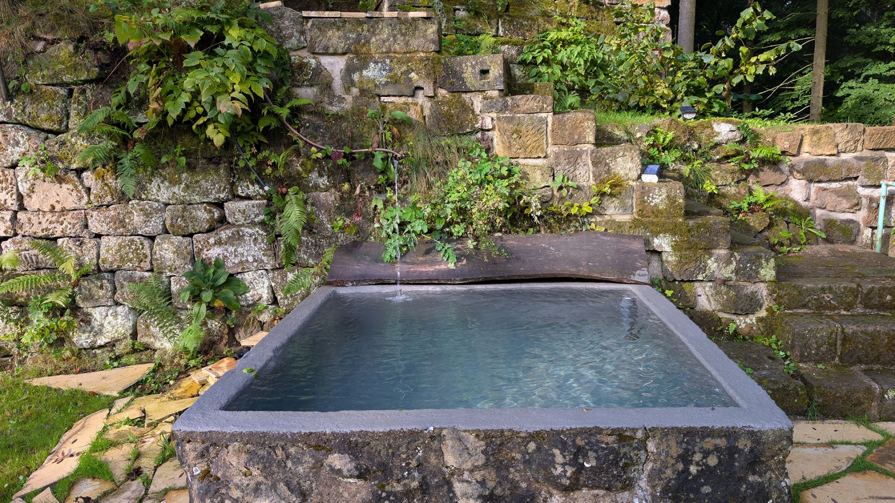 • Gartenbereiche rund ums Haus – vorne, hinten, unten. Mit Sitzplätzen, Liegewiese, Quellwasserbecken.