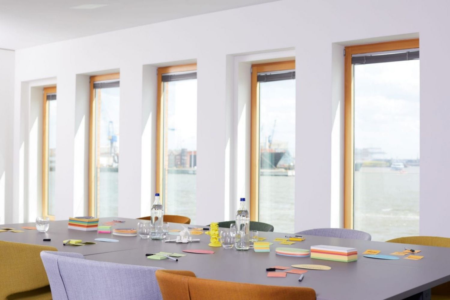 Sobald Sie und Ihre Teilnehmer unseren „Neuland“ betreten, werden Sie von einer einmaligen Panoramaaussicht auf die Elbe und den Hamburger Hafen begrüßt. Vom Containerterminal reicht die Aussicht über die Docks von Blohm + Voss bis hin zur Elbphilharmonie und trägt dazu bei, dass Sie mit Ihren Inhalten auf eine anregende Arbeitsatmosphäre treffen.