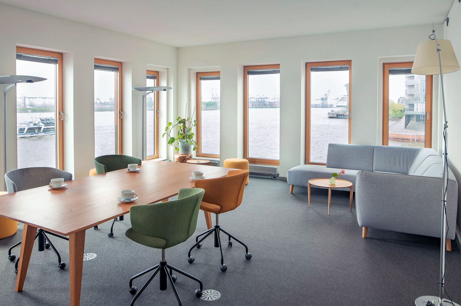 Bestechend ist natürlich auch der Ausblick, den beide Räume bieten. Nicht ohne Grund haben wir entschieden, ihnen den Namen „Weitblick“ zu geben. Hier sehen Sie die Containerriesen schon von Weitem auf den Holzhafen zukommen und haben einiges zu Staunen, sobald sie von den Hafenschleppern direkt vor der südlichen Fensterfront gedreht und zum Terminal Tollerort bugsiert werden.