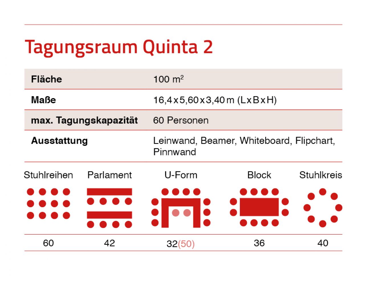 Der Tagungsraum Quinta 2 bietet Platz für bis zu 60 Personen bei einer Fläche von 100 qm.