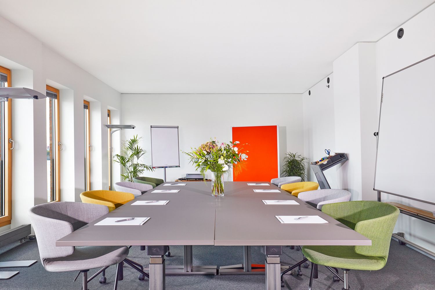 Egal, ob Sie eine klassische Vortragsform oder interaktive Arbeit mit den Teilnehmern planen: Je nach Bedarf sind unsere höhenverstellbaren Tische und die bequemen Stühle vielseitig anzuordnen und ermöglichen es Ihnen, Ihre Veranstaltungen ganz nach Ihren Wünschen und Vorstellungen zu realisieren. Mit bereits im Preis enthaltener modernster Technik und umfangreichem Moderationsmaterial stellen wir Ihnen das passende Werkzeug zur Verfügung, das Sie für Ihre Veranstaltung benötigen. Mehrere Whiteboards, Pinnwände und Flipcharts helfen Ihnen dabei, die Ergebnisse transparent und nachhaltig festzuhalten.