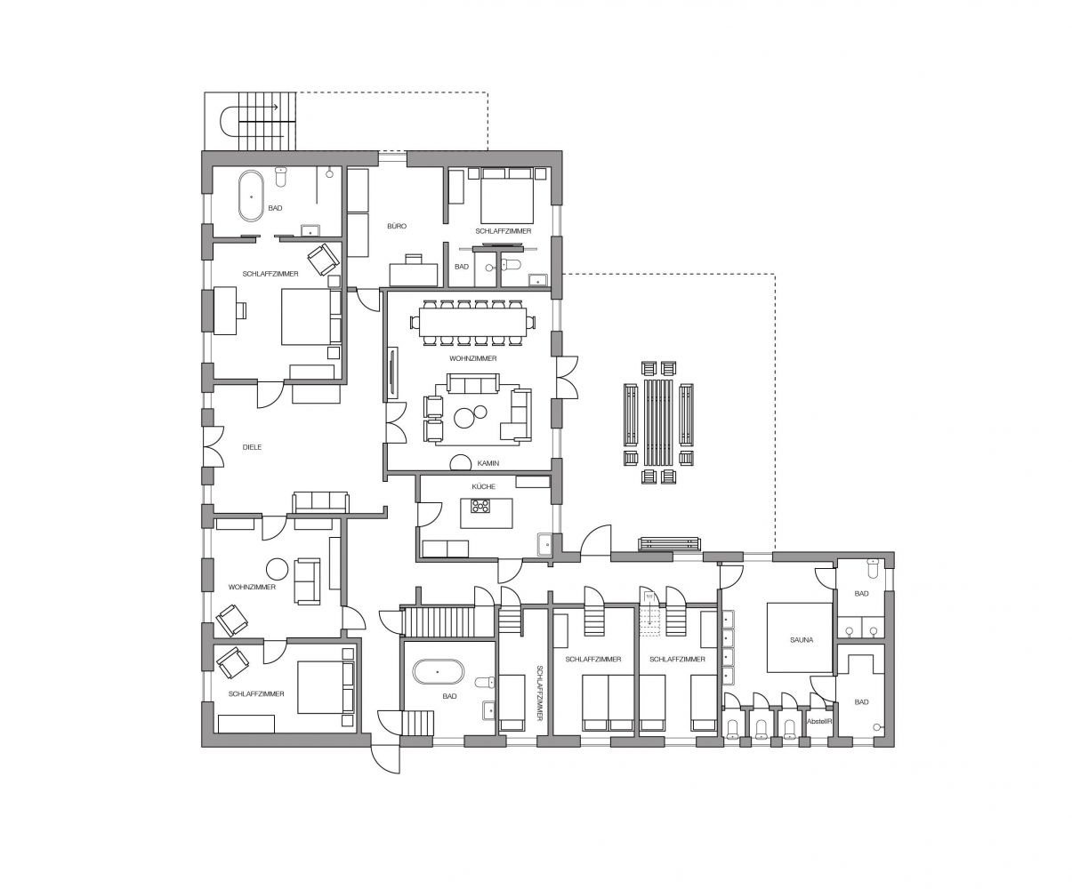 Arbeiten und Erholen in einemIn den Pausen lockt die 1,5 Hektar große Gartenanlage mit Obstbäumen, Terrassen und Sitzplätzen. Für kulinarische Highlights stehen ein klassischer Holzkohlegrill sowie ein Big Green Egg Kamado-Grill bereit. Abends können Sie den Tag an der Feuerschale ausklingen lassen.