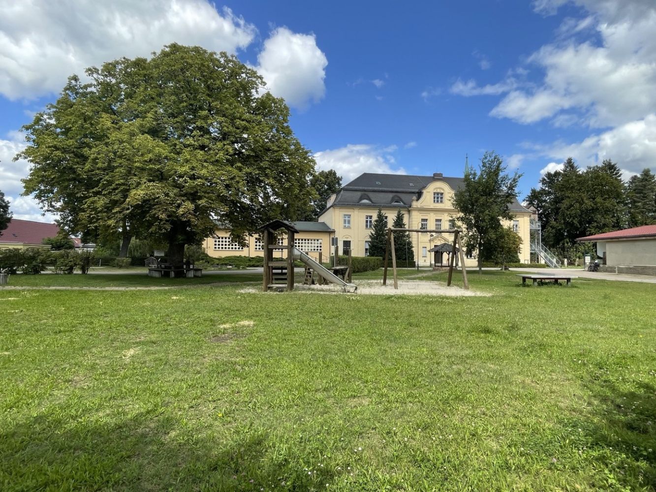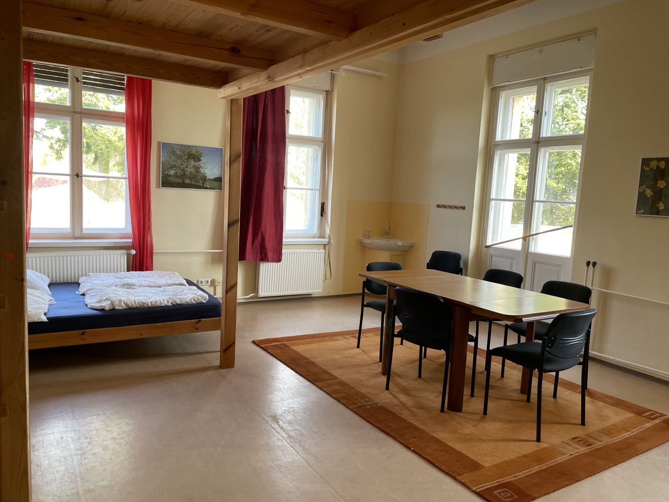 Auf zwei Etagen des neobarocken Schmuckstücks befinden sich jeweils sieben Doppel- und Mehrbettzimmer, einige von ihnen mit ausgedehnten Hochbetten ausgestattet – mit viel Platz zum Entspannen, Lesen und Zeitverbringen. Das Selbstversorgerhaus verfügt zudem über jeweils vier große Gemeinschaftswasch- und Duschräume, vier Seminar- und Arbeitsräume, eine richtige Sporthalle, eine Sauna und einen Festsaal mit angeschlossenem Wintergarten. Das Gruppenhaus bietet viele Möglichkeiten für unterschiedlichste Reisen, Anlässe, Pläne und Herausforderungen. Sprecht mit uns über Eure Wünsche und Bedarfe – gern überlegen wir mit Euch gemeinsam individuelle Lösungen und Konzepte.