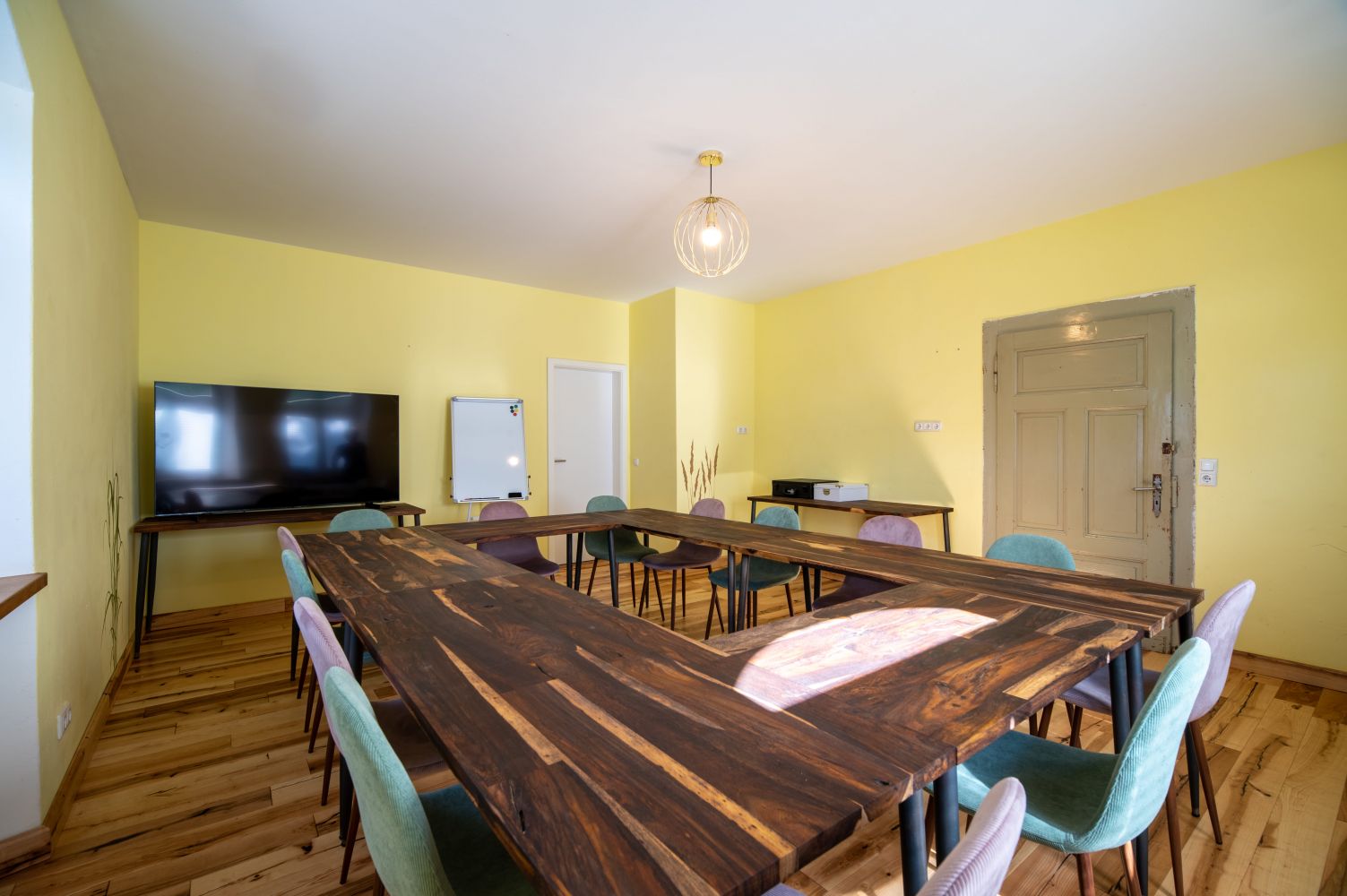 Mehrere flexible Aufenthaltsbereiche, die du als Workspaces nutzen kannst.Große, gut ausgestattete Küche zum gemeinsamen Kochen oder Catering-Setups.Lounge- und Gemeinschaftszonen für informelle Meetings.Ob du einen Workshop mit Whiteboard-Sessions planst oder eine konzentrierte Projektphase – die Location gibt dir Räume, die sich deinem Team anpassen.
