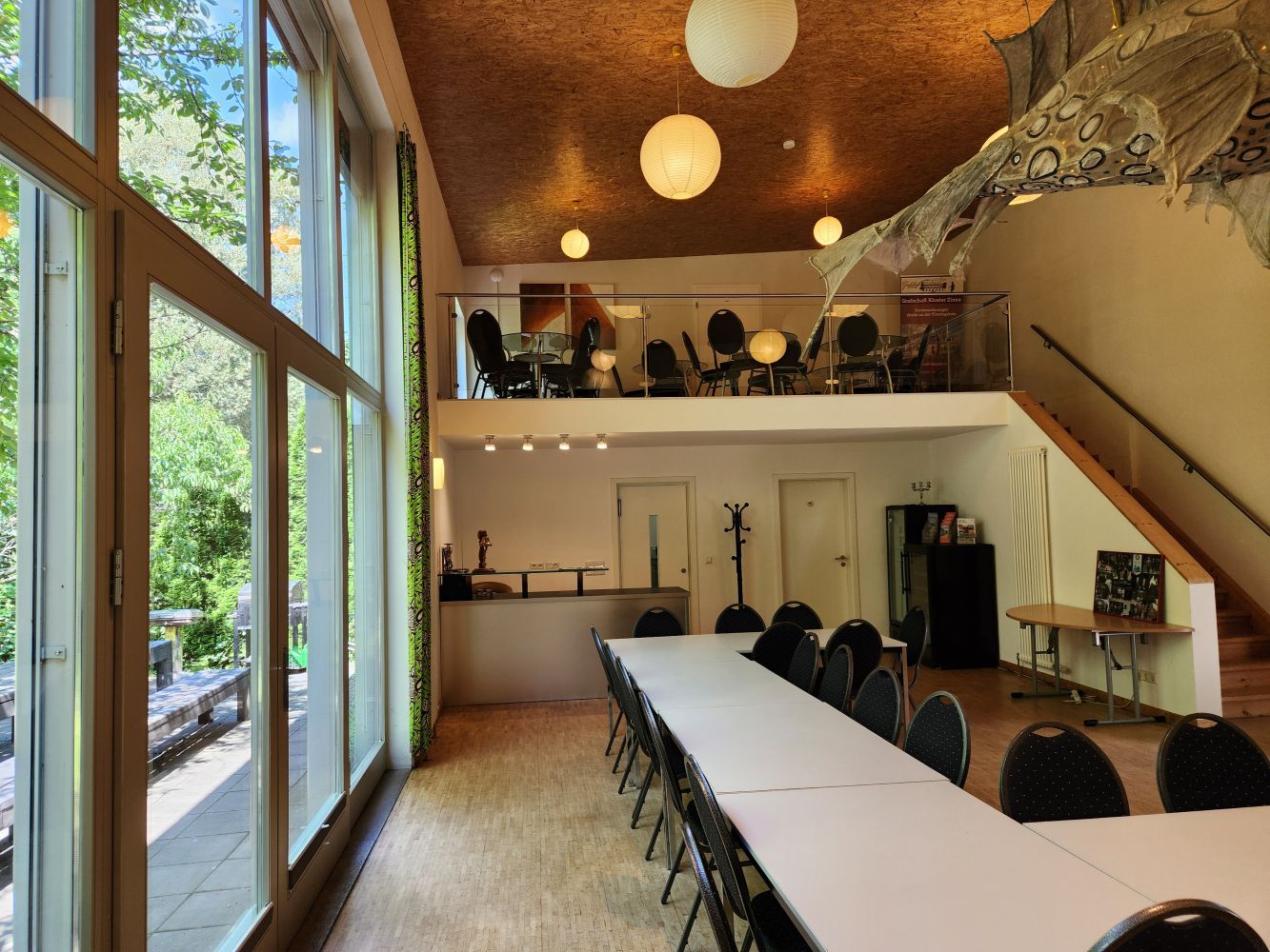 Ein moderner Festsaal bietet Raum für diverse Seminare, Tanzmöglichkeiten, Yoga, Meditation und verschiedenste Feierlichkeiten... Bis zu 60 Personen finden hier Platz. Dementsprechend sind genügend Tische und Stühle und eine kleine Küche, mit voller Ausstattung für diverse Veranstaltungen vorhanden. Extra Sanitäreinrichtungen stehen zur Verfügung.