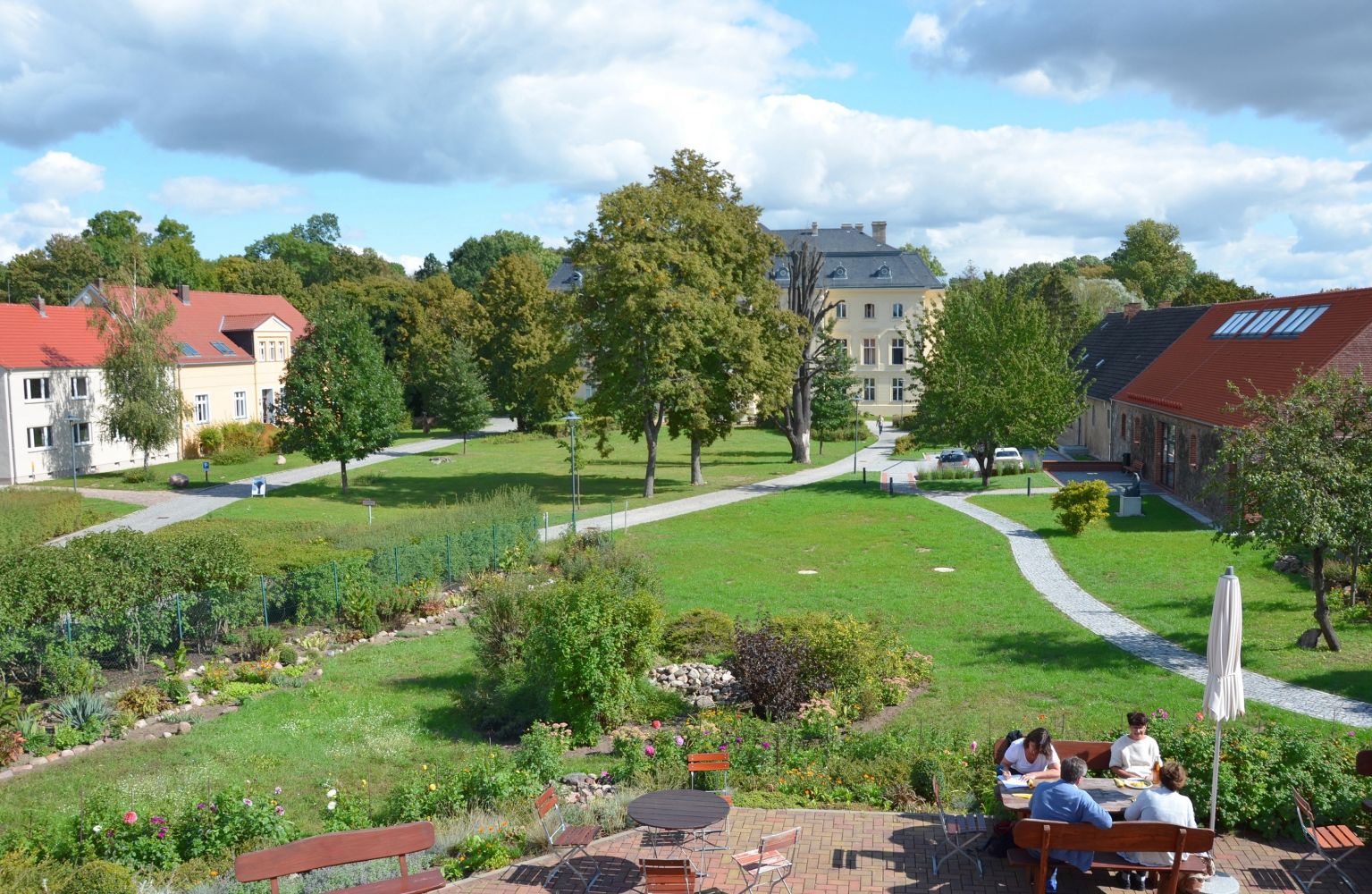 Direkt an das Schloss schließt eine große Parkanlage an, die bei gutem Wetter zum Arbeiten unter freiem Himmel oder einen Spaziergang einlädt. Ein „Grüner Seminarraum“ bietet die Möglichkeit zur Gruppenarbeit an der frischen Luft. Dank eines Grillplatzes und eines Pizzaofens kann man gemeinsamen Kochen und Essen, für lange Sommerabende steht eine Lagerfeuerstelle zur Verfügung. Zur Erkundung der Umgebung können Fahrräder ausgeliehen werden. Ein Dorfladen mit Kaffee- und Imbissangebot lädt zum Verweilen in den Pausen ein. Von der Terrasse bietet sich ein wunderbarer Blick auf das Schloss. Kunstinteressierte können das Gustav Seitz Museum besuchen oder die öffentlichen Kunstwerke auf der Gutsanlage entdecken.