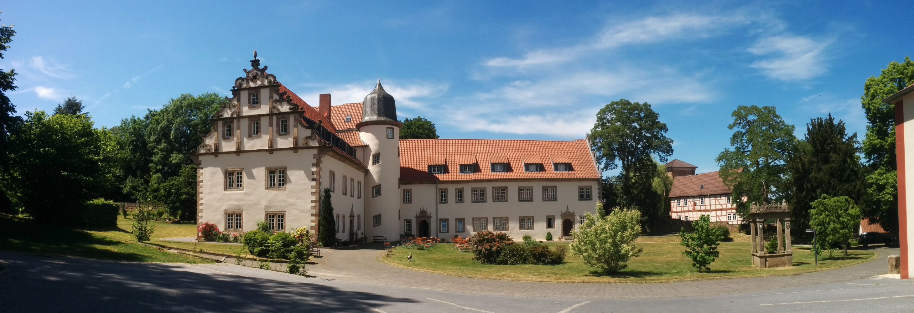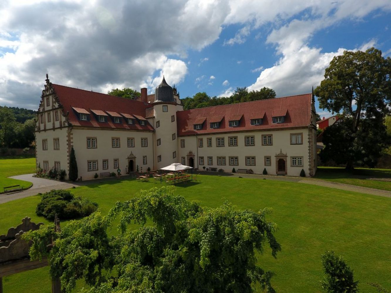 Neben dem Renaissanceschloss von 1611 besteht es noch aus vielen weiteren Gebäuden. Eine gute Unterkunft für Ihr Seminar, Tagung, Event, Retreat, Yoga Kurs, Meditation, Tanzkurs, Freizeit, Chorprobe, Familientreffen, etc.