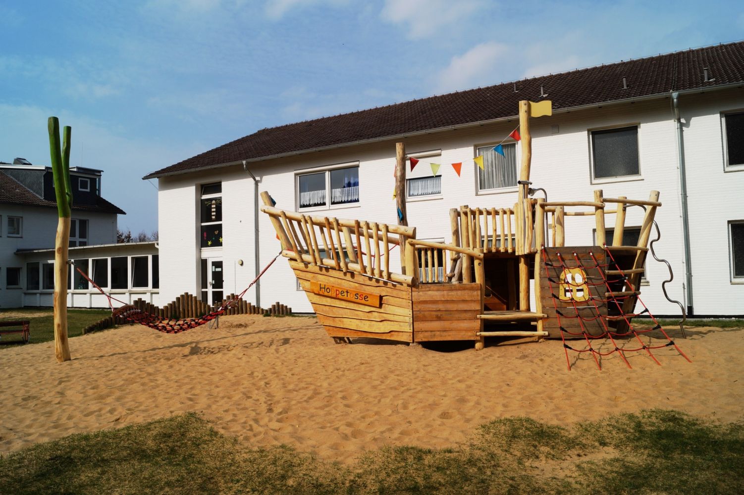 SpielvergnügenFür Kinder und Jugendliche steht direkt am Haus ein großer Spielplatz mit Hüpfkissen (70 qm), einer Pit-Pat-Anlage (Billard-Golf) mit 15 Bahnen, Spielschiff, einer Kletterhütte zum Bouldern, mehreren Schaukeln und weiteren Spielgeräten zur Verfügung. Darüber hinaus befinden sich dort ein Fußballplatz, ein Beachvolleyballfeld, ein kleiner Basketballplatz sowie eine Grillecke und eine Feuerstelle. Im Haus besteht die Möglichkeit zum Tischtennisspiel und zum Kickern (Tischfußball).