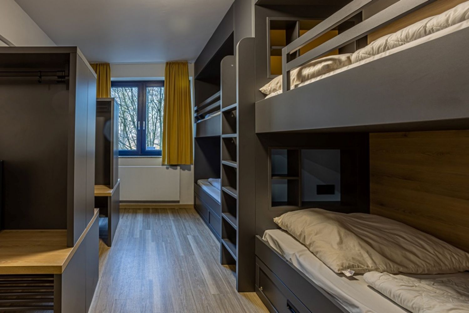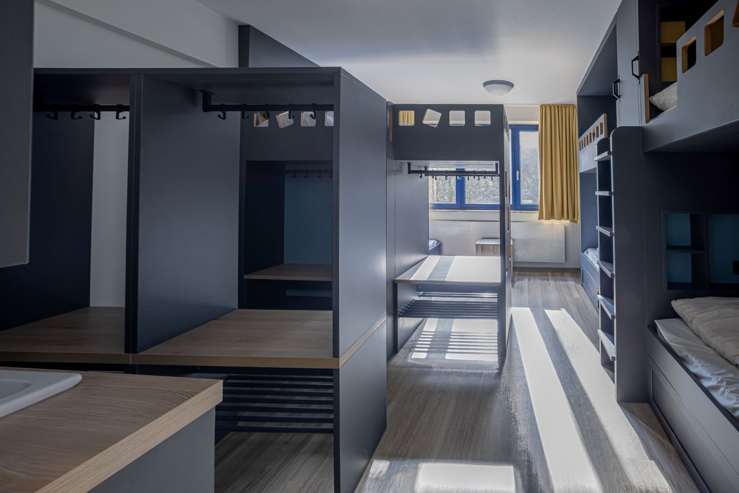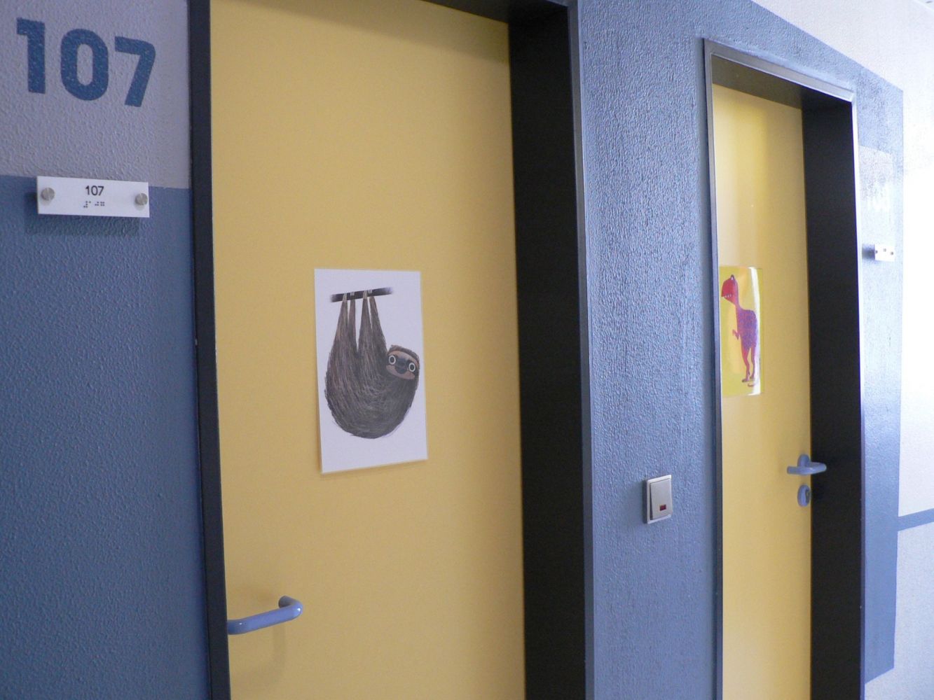 Ausstattung der Zimmer Insgesamt stehen 24 Zimmer auf zwei Schlafetagen zur Verfügung. Pro Etage sind vier Vierbett- und vier Sechsbettzimmer für die Kinder und Jugendlichen zu finden. Die Mehrbettzimmer haben eine Waschgelegenheit auf dem Zimmer und gemeinschaftliche sanitäre Anlagen auf der Schlafetage. Zudem befinden sich auf jeder Schlafetage vier Zweibettzimmer mit eigenem Bad, welche von den betreuenden Personen auch als Einzelzimmer genutzt werden können. Vier Vierbettzimmer haben ein Zusatzbett, sodass insgesamt 100 Betten zur Verfügung stehen. Es besteht die Möglichkeit, weitere Notmatratzen in den Zimmern bereit zulegen. Die abschließbaren Fenster sind mit Insektenschutzgitter ausgestattet.