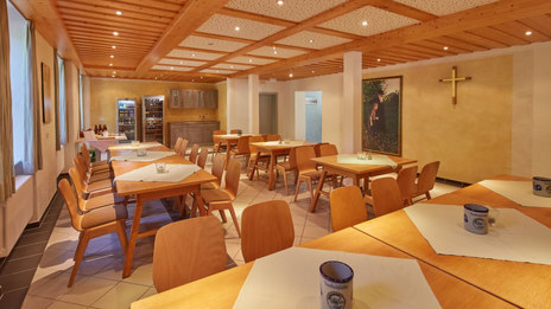 Mit Räumen zum Genießen Eine gemütliche Sitzecke mit Zimmerbrunnen im Rezeptionsbereich, eine durchgehend geöffnete SB-Cafeteria (Kaffee, Tee, kalte Getränke, Wein, Bier, Knabbereien) mit Zeitungs- und Zeitschriftenecke, die "Klause" im Schankstubenstil mit großem Flachbild-Fernseher laden zum Genießen, Entspannen und Begegnen ein. Unser Küchenteam verwöhnt die Gäste im frisch renovierten, hellen Speisesaal mit einem reichhaltigen Frühstücks-, Mittags- und Abendbuffet. Lunchpakete, Kaffee und Kuchen oder Stehkaffee sind selbstverständlich ebenso buchbar wie vegetarische und glutenfreie Kost.