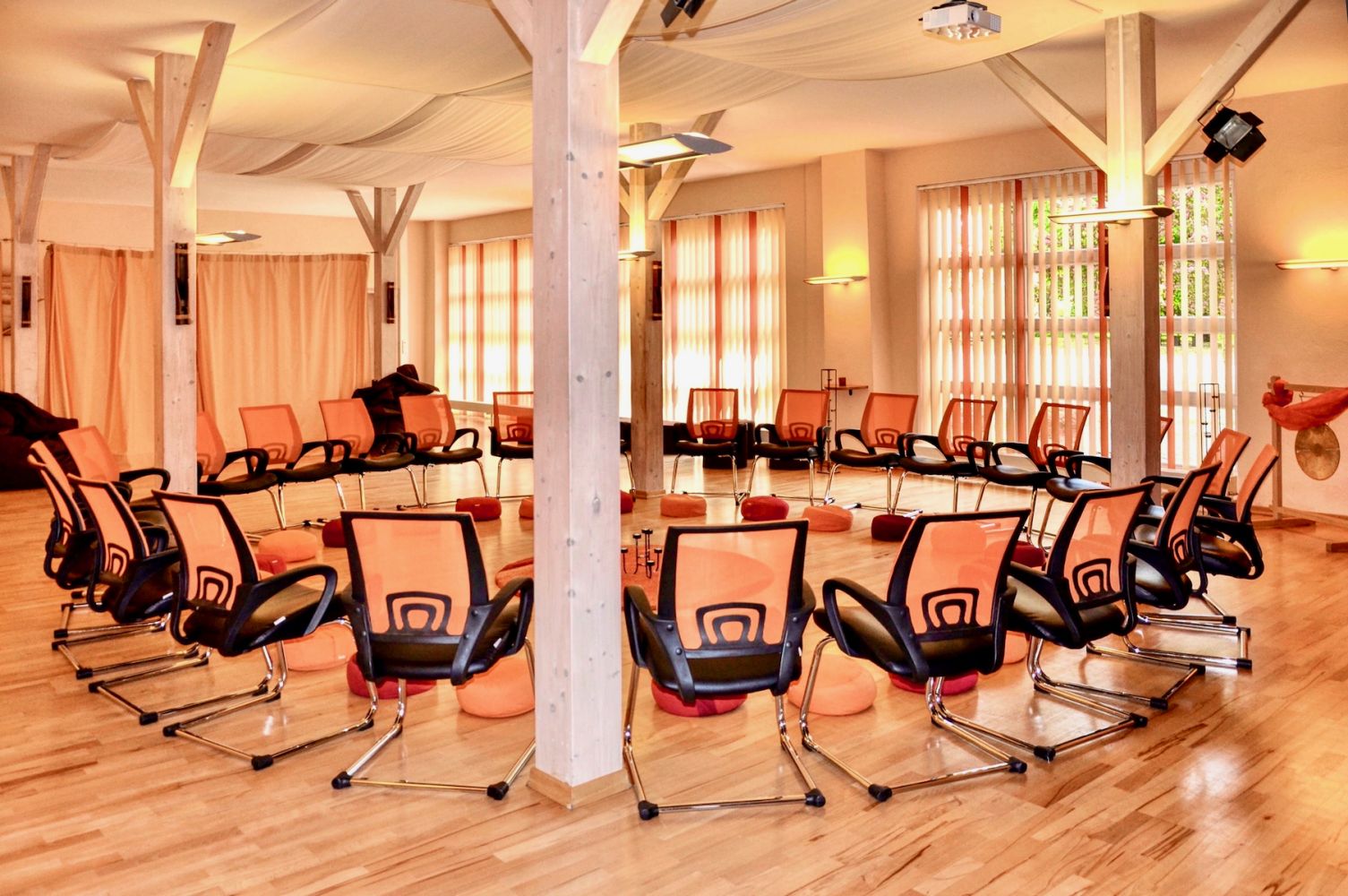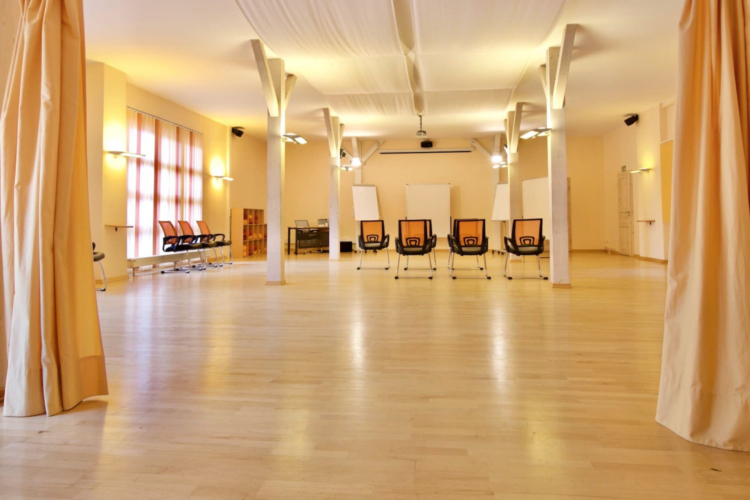 An der Frontseite der Piazza befindet sich dieser 158 qm große Raum. Er ist mit einem schönen Holzparkett ausgestattet und bietet Platz für ca. 35 Personen. Moderne Präsentations- und Audiotechnik wie Beamer, Smartboard und Musikanlage sind nach den Wünschen der VeranstalterInnen abrufbar. Ebenso hält das Haus Decken, Matten und Meditationskissen bereit. Achtung: Im Raum befinden sich 6 Holzpfeiler (ehemalige Stallung mit Blick auf den kopfsteingepflasterten Piazza-Hof), die dem Raum ein warmes Ambiente verleihen, bei Tanzseminaren aber "umschifft" werden müssen.