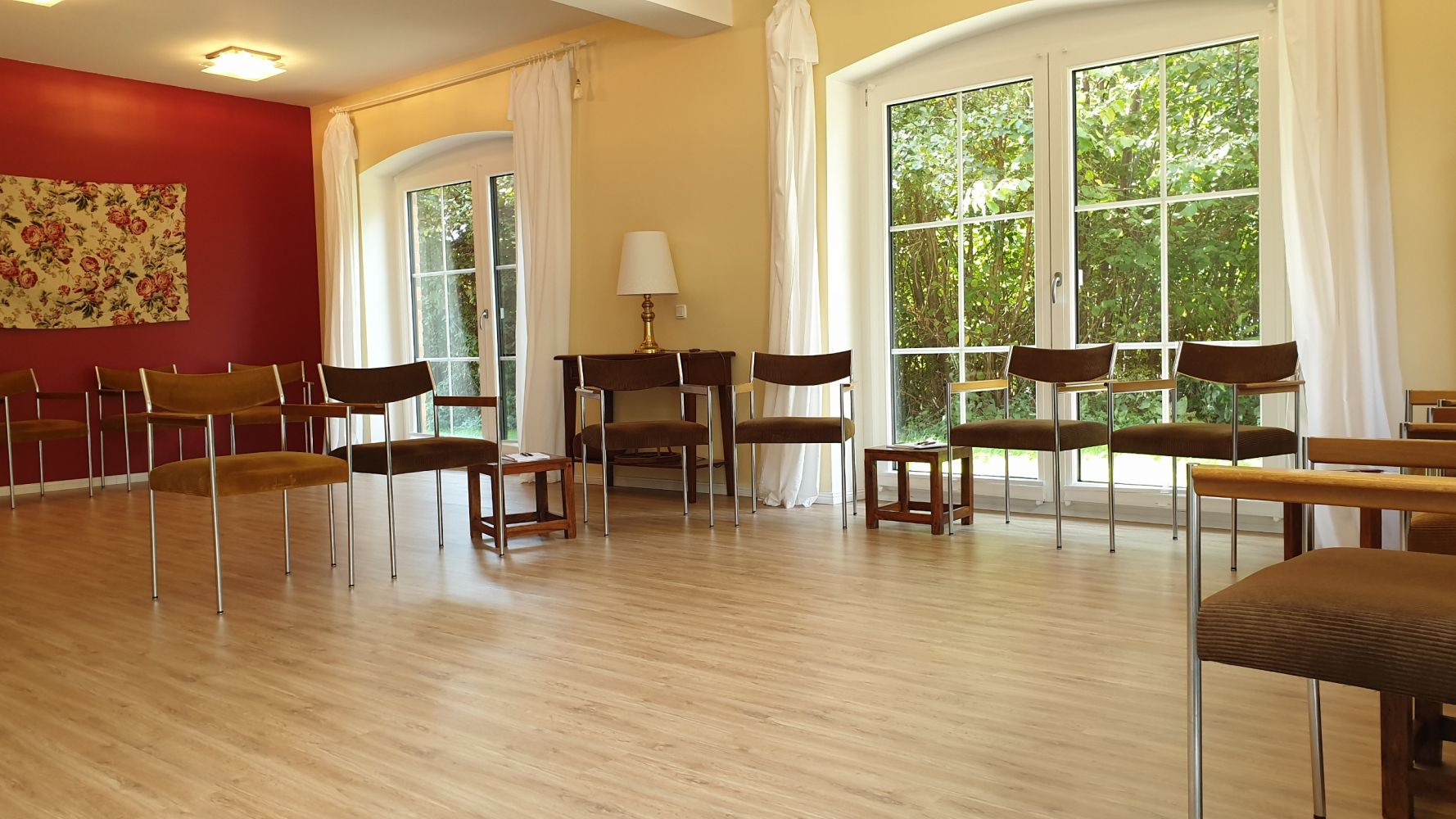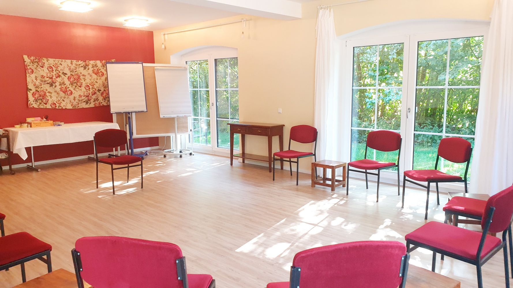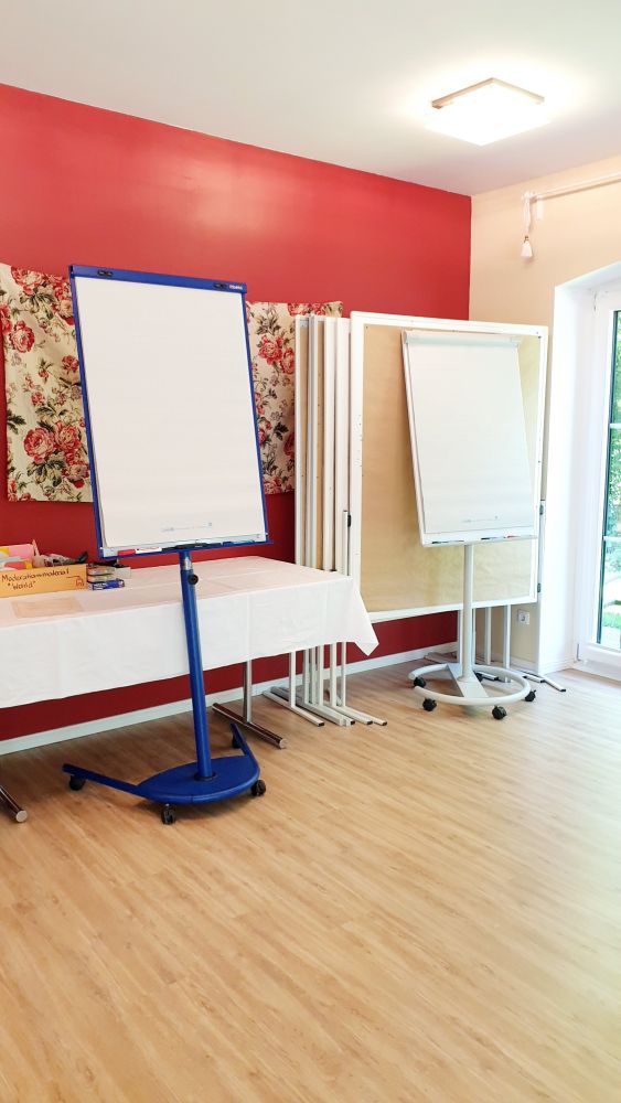 Besonders ruhiger Seminarraum in unserem komfortablen Gästehaus. Bodentiefe Fenster garantieren Licht und Luft in Hülle und Fülle. Mit Blick in die Natur und exclusiver Nutzung der Wiese hinter dem Haus für Outdoor Teamevents. Professionelle Ausstattung mit Beamer, 2 FlipCharts, 6 Moderationswänden und Moderationskoffer. Parkplätze direkt vor dem Haus.