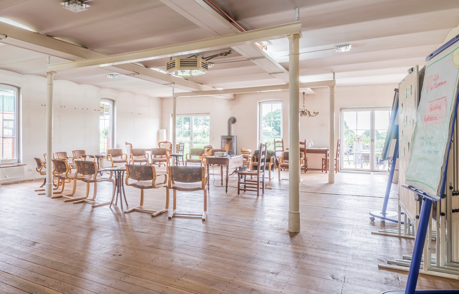 Großer, heller, lichtdurchfluteter Seminarraum mit Blick in die Natur bietet eine einzigartige Lernatmosphäre für Ihre Mitarbeiter und Führungskräfte. Platz für Gruppenarbeit ist reichlich vorhanden. Direkter und exclusiver Zugang auf die Terrasse zum Arbeiten unter freiem Himmel. Der Seminarraum ist professionell ausgestattet mit Beamer, Flip Charts, Moderationswänden und -equipment. Metalog Teamübungen stehen zur freien Nutzung bereit.Erleben Sie den Freiraum, der Ihre Veranstaltungen in unserem Seminarhaus zu etwas ganz Besonderem werden lässt.