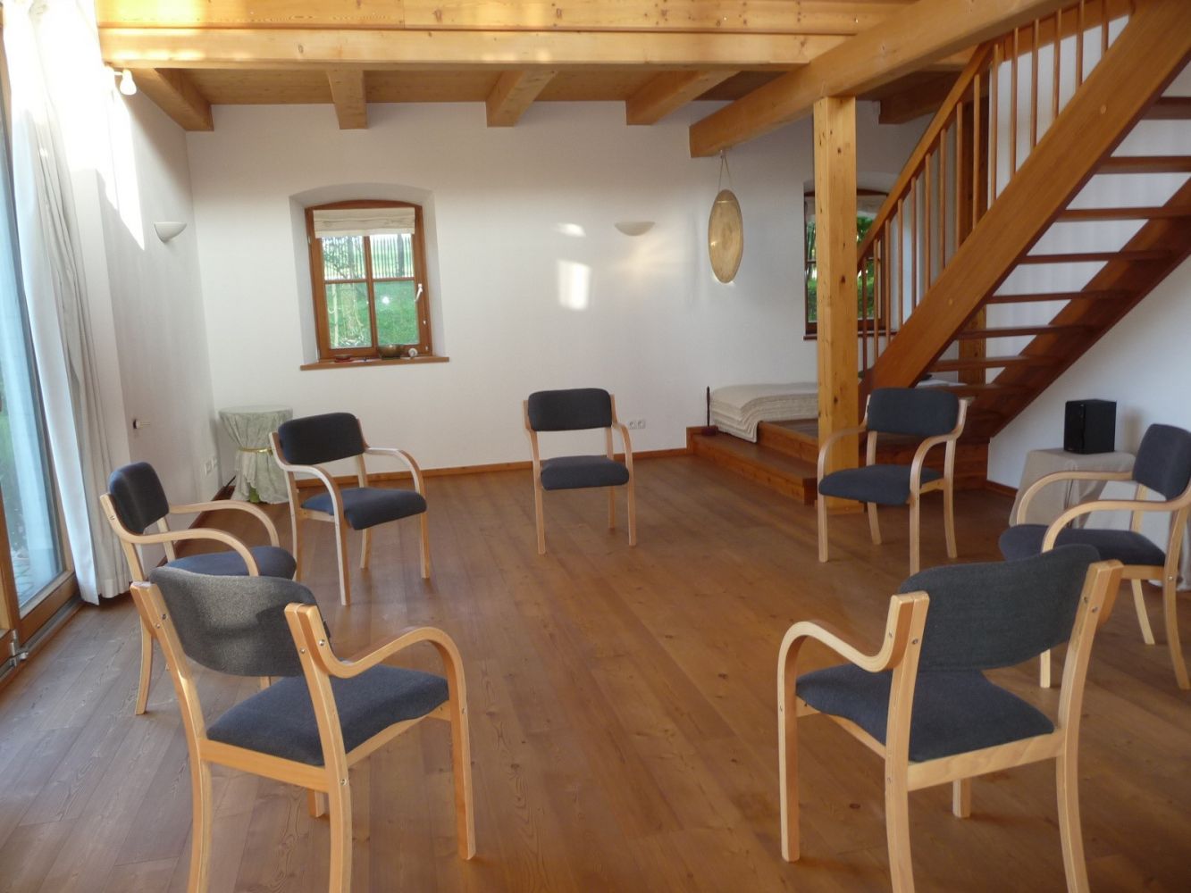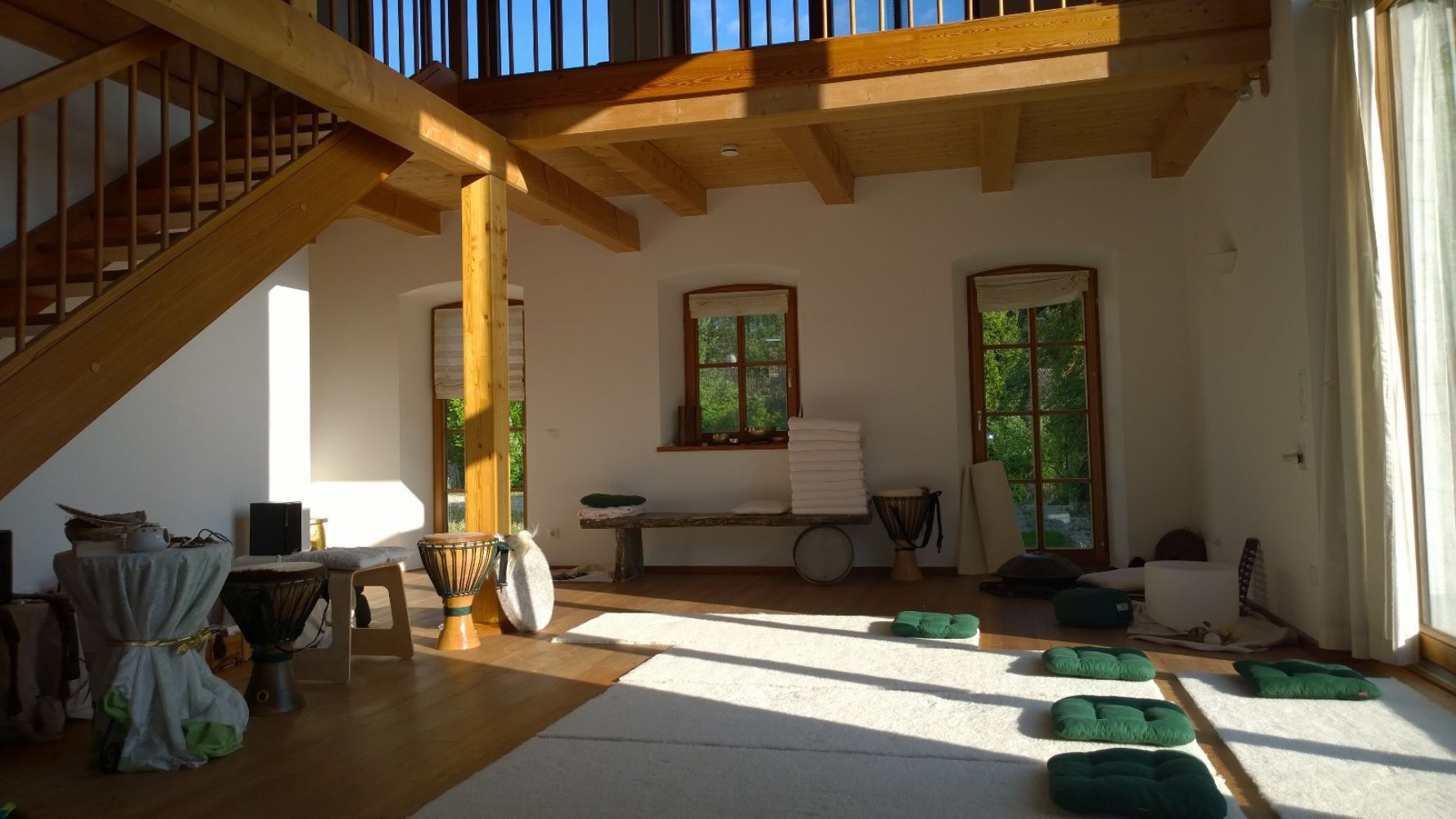Lichtdurchfluteter Seminar-Raum Auf dem HerzKulturHof erwartet Sie der "Licht-Raum" im Sonnen-Haus mit 55 qm, mit Lärche-Parkettboden. Je nach Bedarf stehen hochflorige Schafwollmatten, Meditationskissen, Decken, Tische und Holzstühle für Sie bereit. Außerdem eine sehr hochwertige Rundum-Strahler Musik-Anlage mit Röhrenverstärker. ( Purer Klang-Genuß )