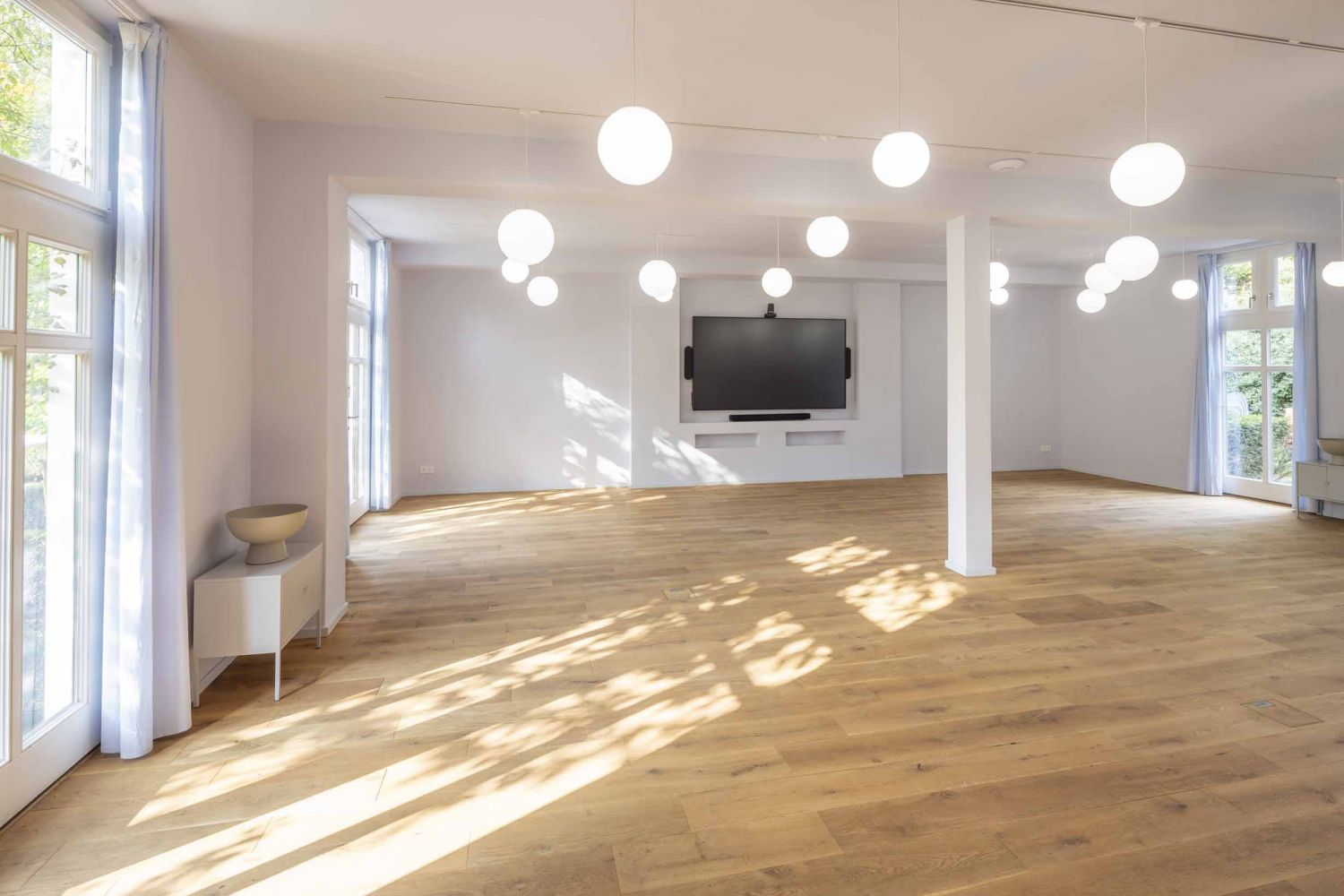 Unsere 2021 im Erdgeschoß des Seminarhaus (Hefkehof) entstandener Seminarraum bietet Platz für bis zu 50 Personen und ist mit modernster Technik, Glasfaserkabel (überall auf dem Hof) und einem großartigen Soundsystem ausgestattet. Vier in der Decke integrierten Lautsprecher bieten vollsten Sound, auf dem großen 96 Zoll TV, den Ihr auf den Bildern seht. Außerdem gibt es eine voll ausgestattete Küche mit Bar und Esstisch, die man durch eine Falttür abtrennen kann, eine eigene Garderobe und ein WC.