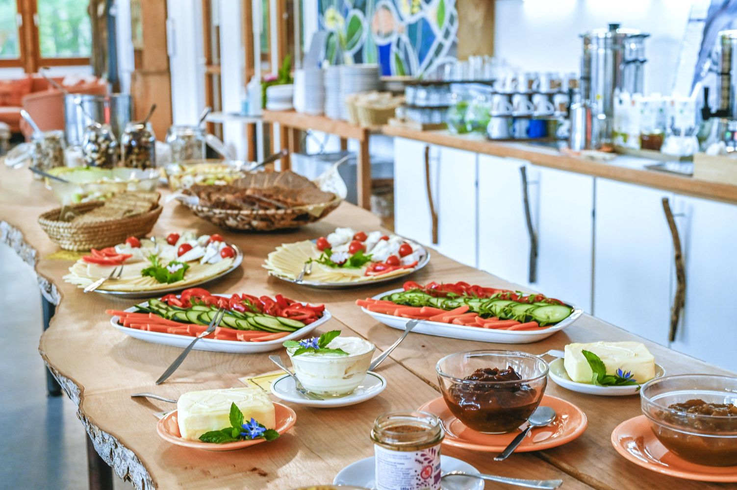 Unsere Küche ist ein zentraler Bestandteil des Hauses: frisch, biologisch, vegetarisch – auf Wunsch auch vegan. Viele Zutaten stammen aus der eigenen Solidarischen Landwirtschaft. Wasser, Tee und Kaffee sind inklusive. Snackpausen, Sondermenüs und Rücksicht auf individuelle Ernährungsbedürfnisse sind nach Absprache möglich. Eine Selbstversorgungsküche kann optional genutzt werden.